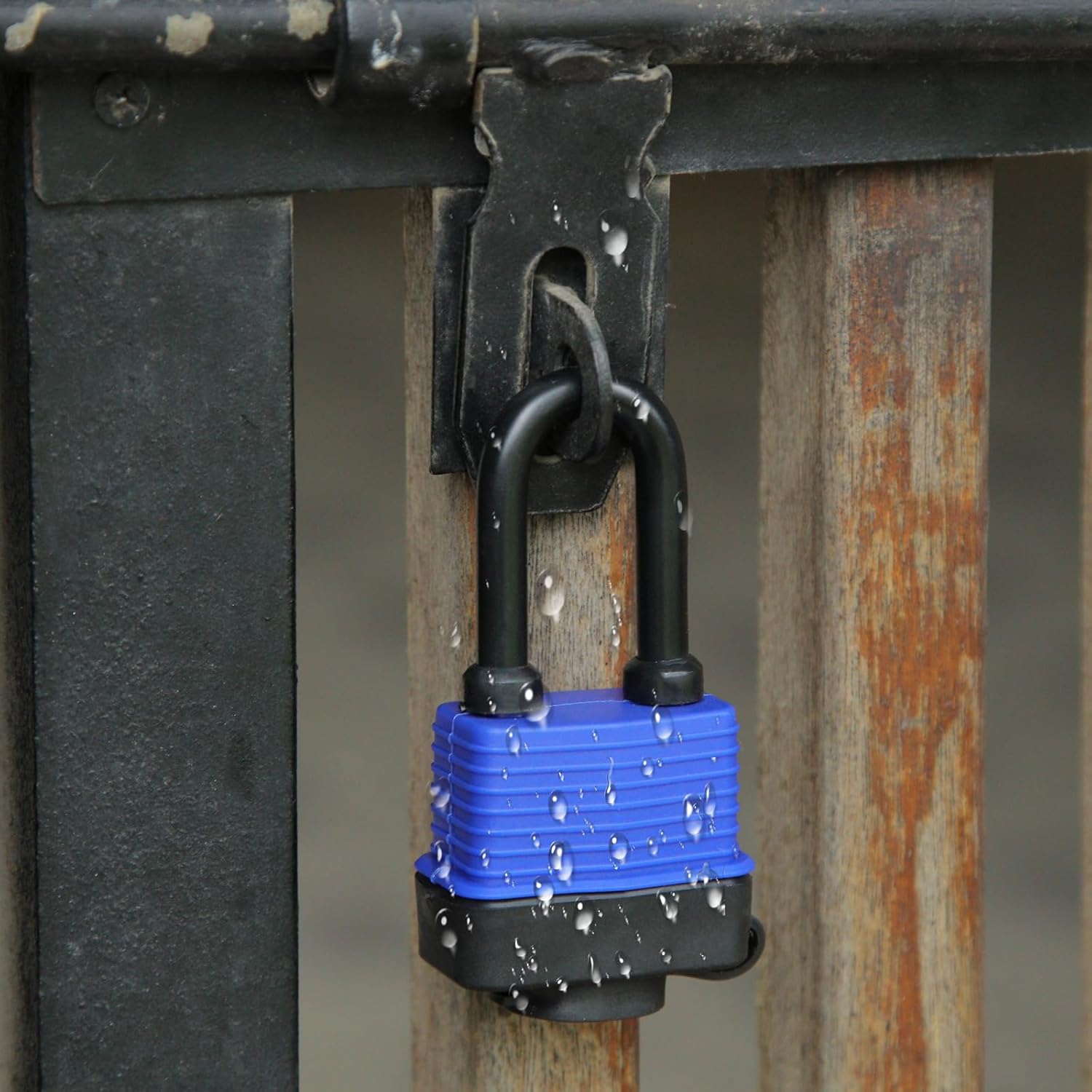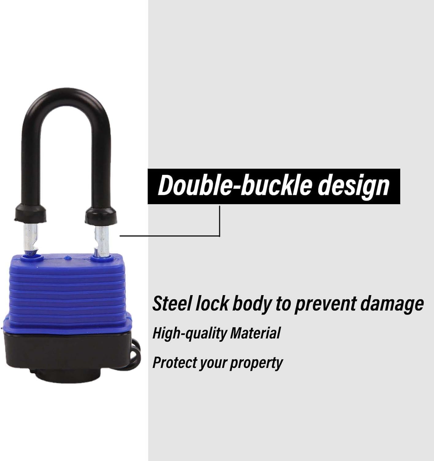Crafted with excellence, this padlock is designed for various applications, from securing outdoor fences and gates to tools boxes. It boasts a solid steel lock body, a brass cylinder, and a hardened steel long shackle, all covered by waterproof blue PVC material.