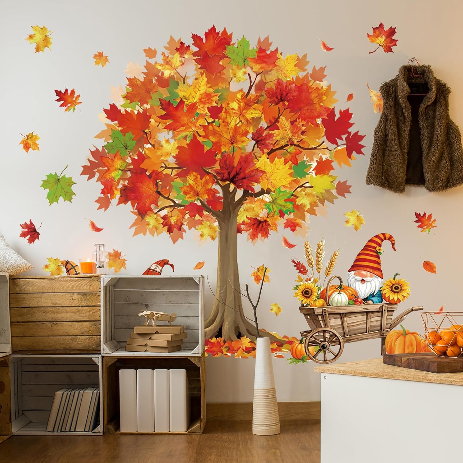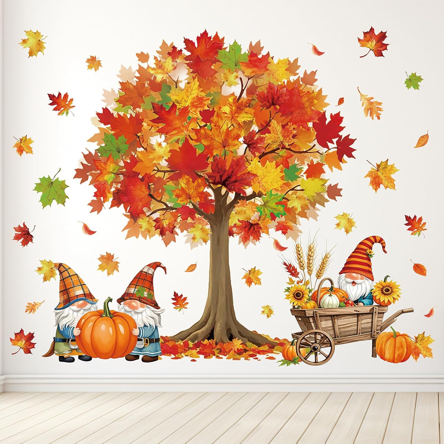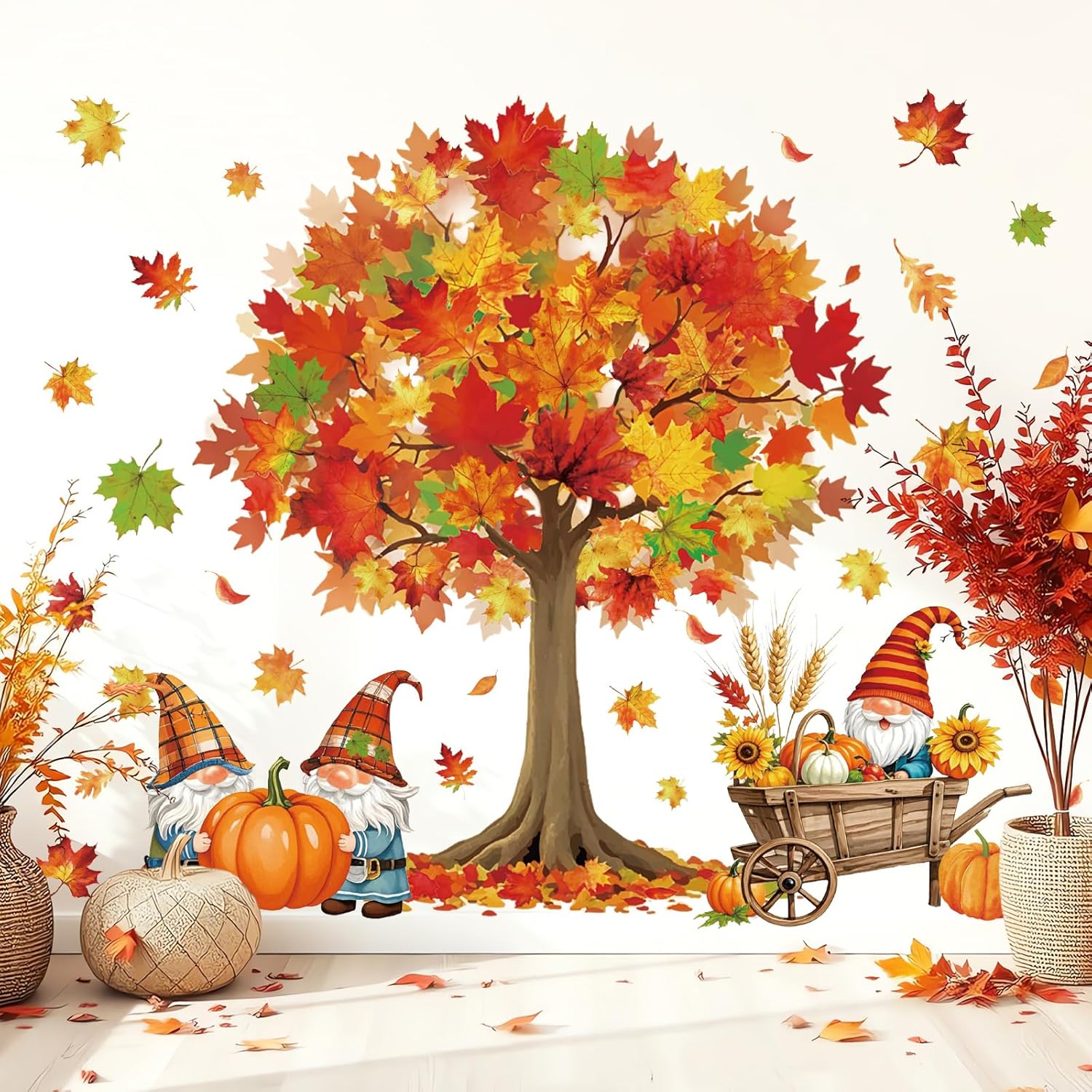 Fall Wall Stickers Maple Tree Leaves Gnome Wall Stickers Peel and Stick Large Room Mural Decals for Autumn Harvest Thanksgiving Party Home Nursery Bedroom Decor