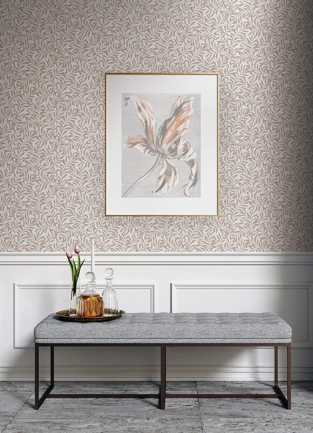 Terracotta peel and stick wallpaper with botanical accents