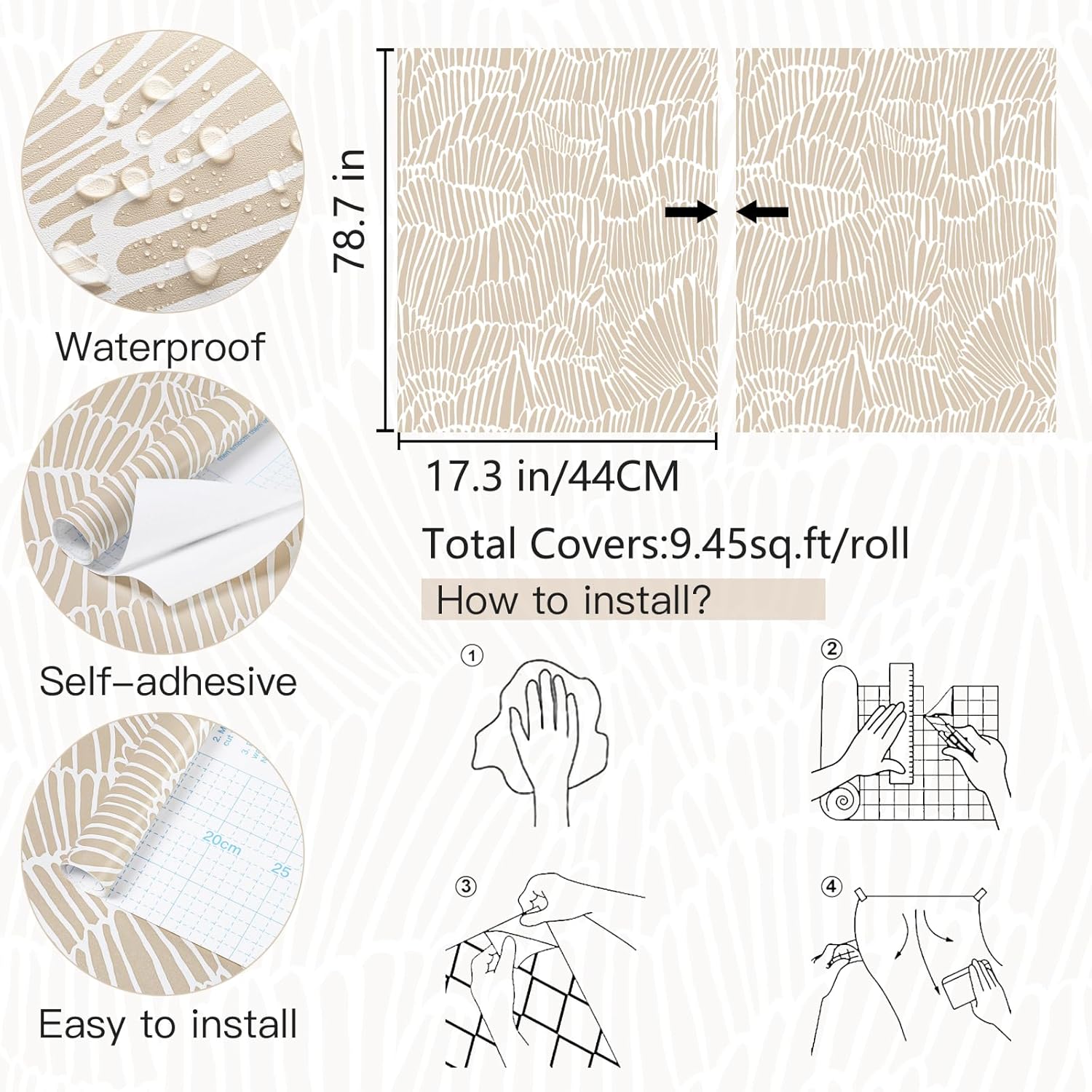 【SIZE AND MATCHING】: Each roll of the beige peel and stick wallpaper measures 17.3″×78.7″ and approximately covers an area of 9.45 square feet. Vertical match