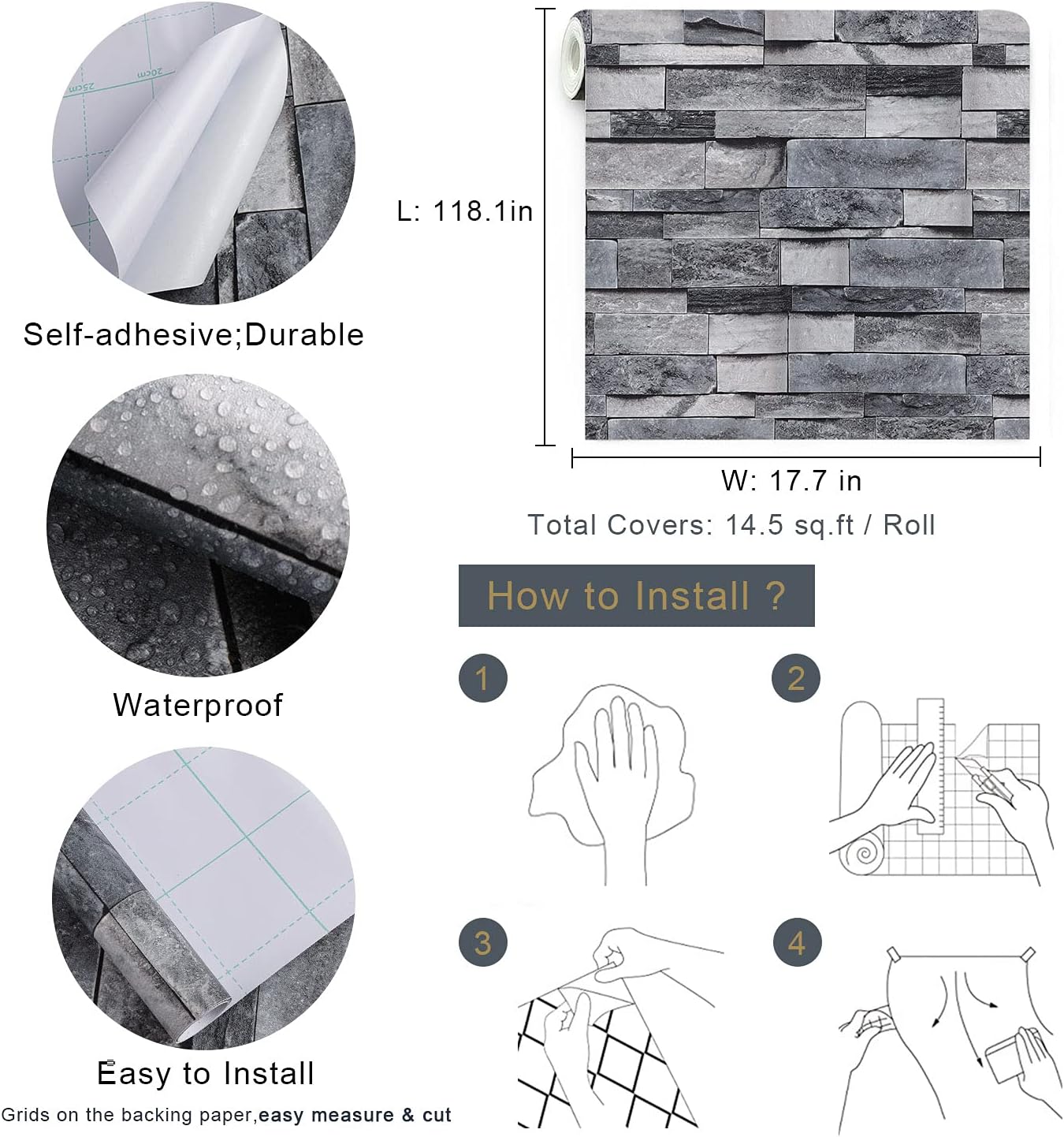 Color:Grey. Design:Faux Stone Look. Size:17.7″x118.11 “(45x300cm). Total Covers:14.5 sq.ft/Roll