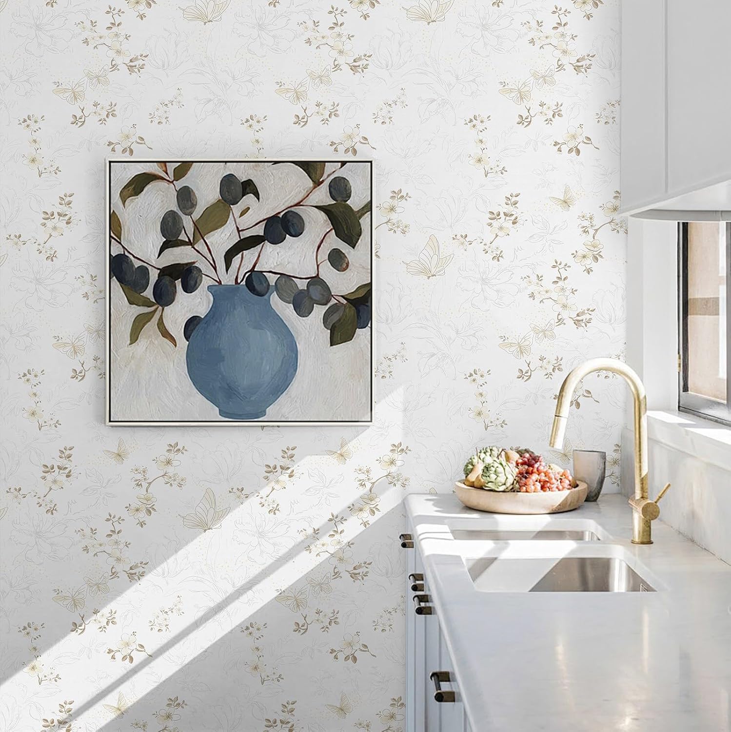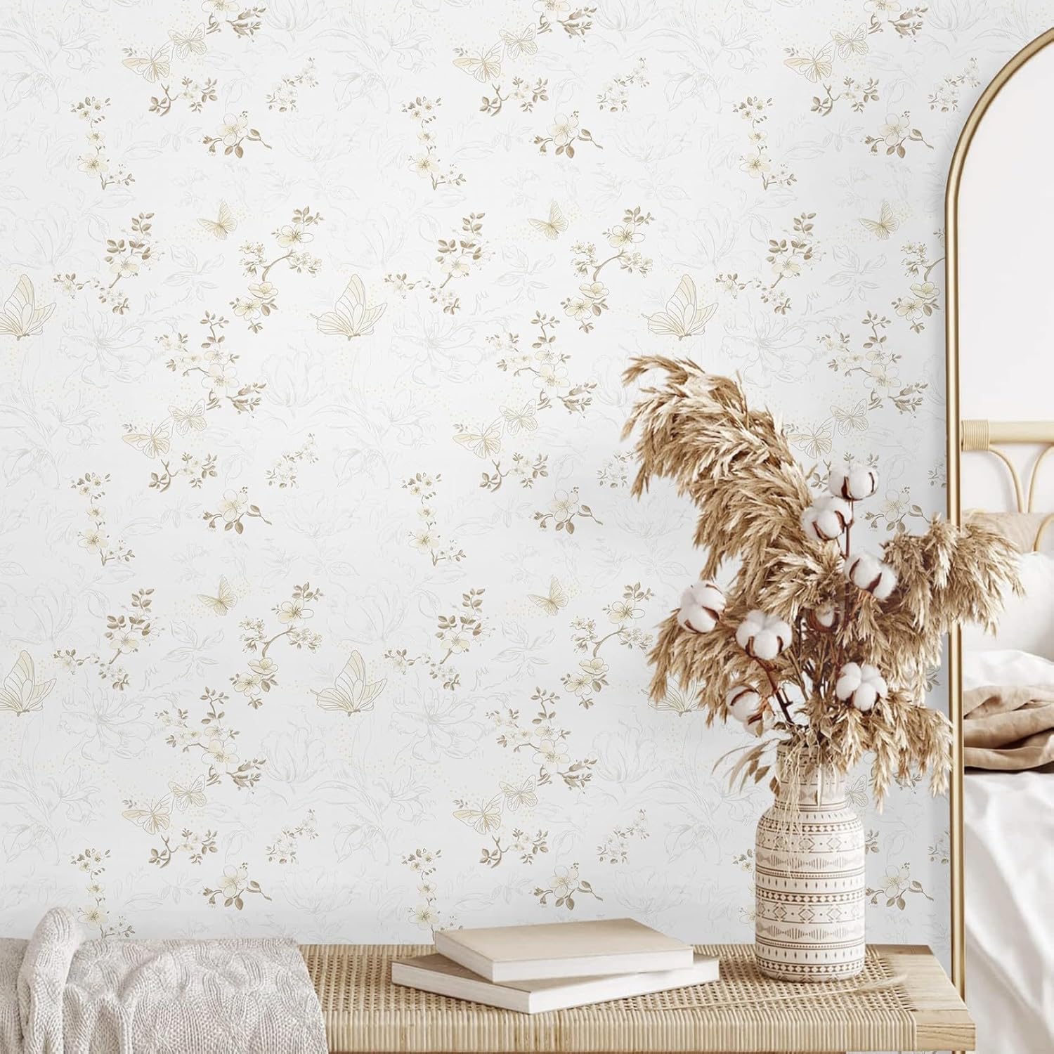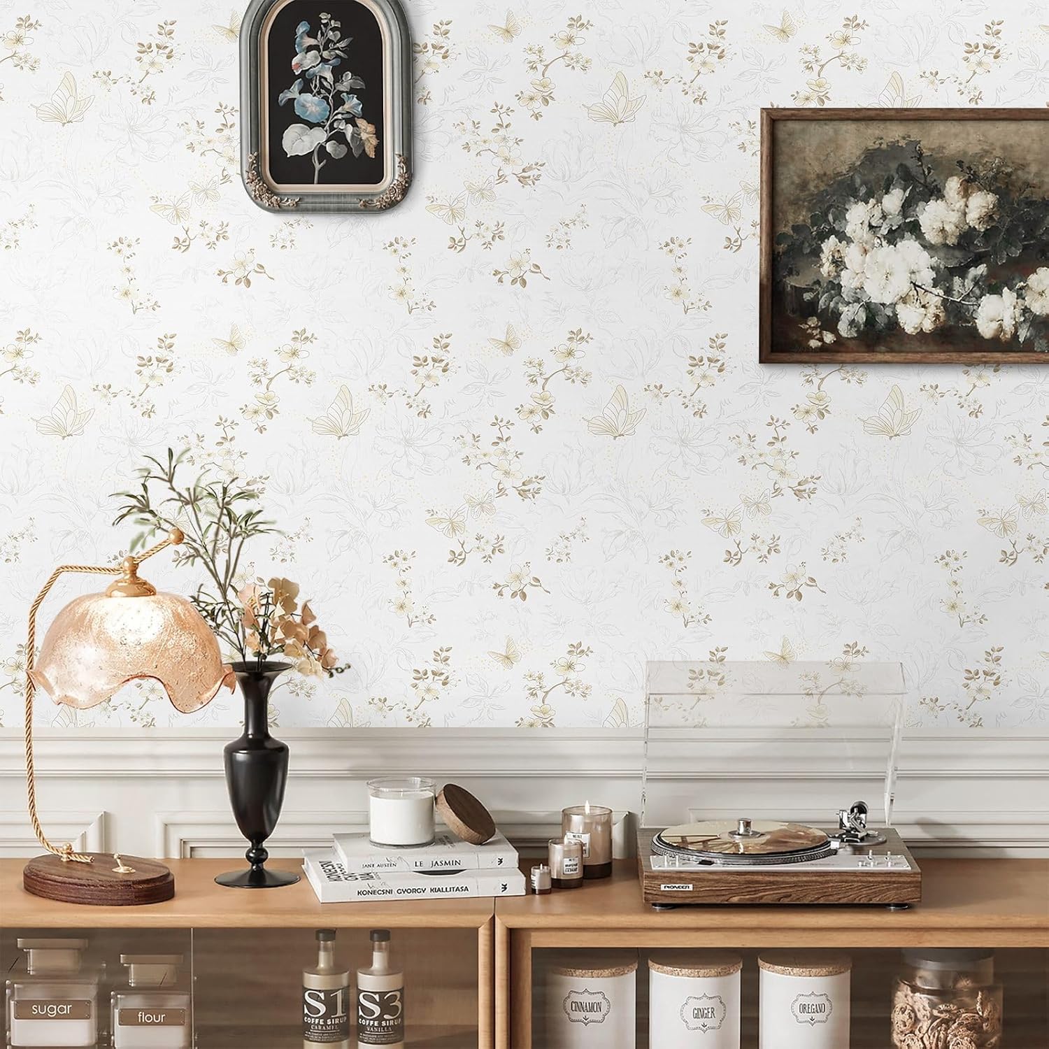 【DESIGN】–Vintage floral wallpaper.Derived from the desire for the beauty of nature, light beige flowers and butterflies are distributed in a dynamic way, creating a soft and warm home atmosphere, simple but without losing sophistication.The upgraded thickened waterproof material is suitable for a wide range of home styles and perfect for large area decoration.